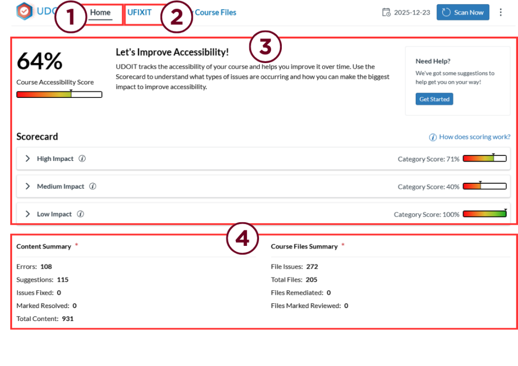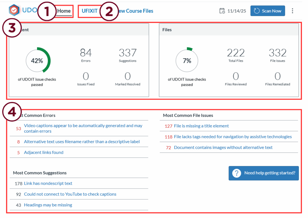 On the UDOIT Home page (1) you can see a summary of the scan results.