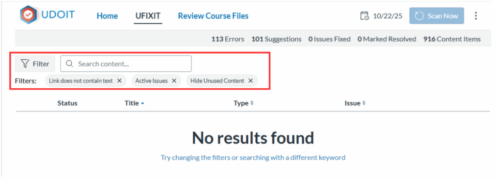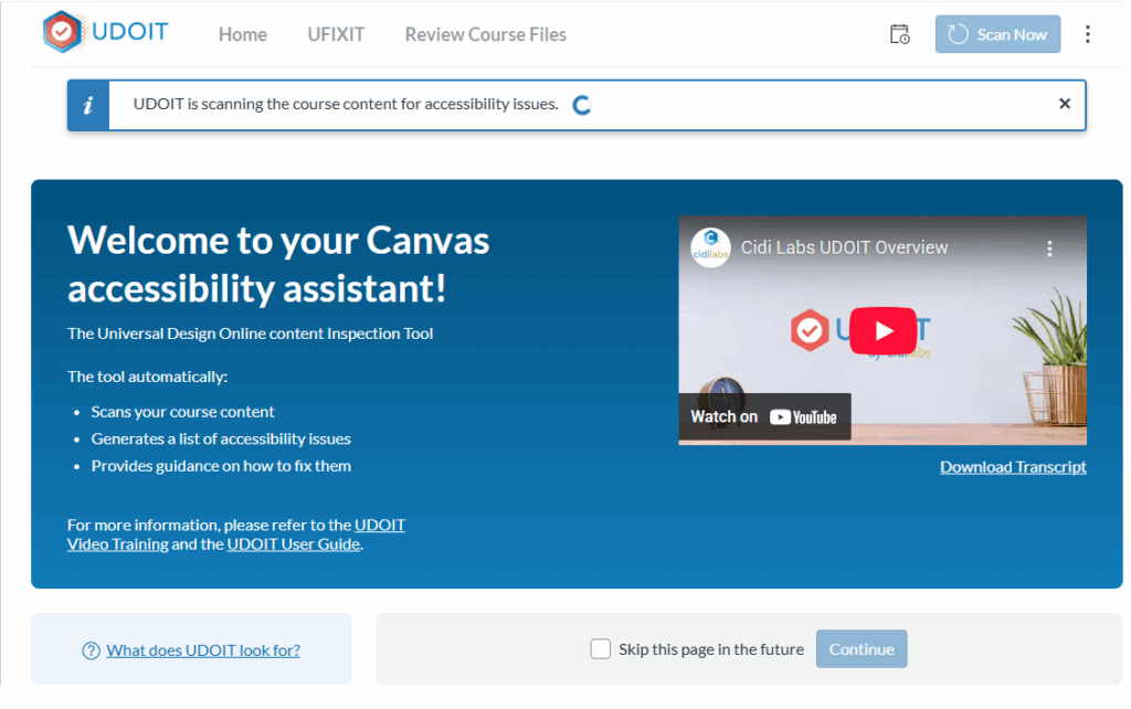 You’ll find a link for UDOIT in the left-hand course navigation in Canvas. Once you click on the link, and authorize UDOIT in your course if necessary, you’ll see the Welcome page. If this is the first time loading UDOIT in your course, a scan will start automatically. You should a message indicating a scan is running. If no scan starts, you can begin one manually by clicking “Scan Now”, in the top right.
