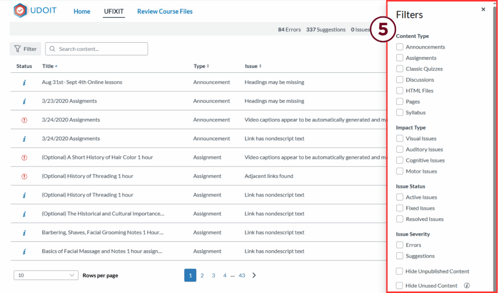 If you click directly on the UFIXIT (2) tab you’ll open a new page that lists every issue in your course. This list can be extensive and may span several pages. You can navigate through pages at the bottom, or increase the number of items listed per page.