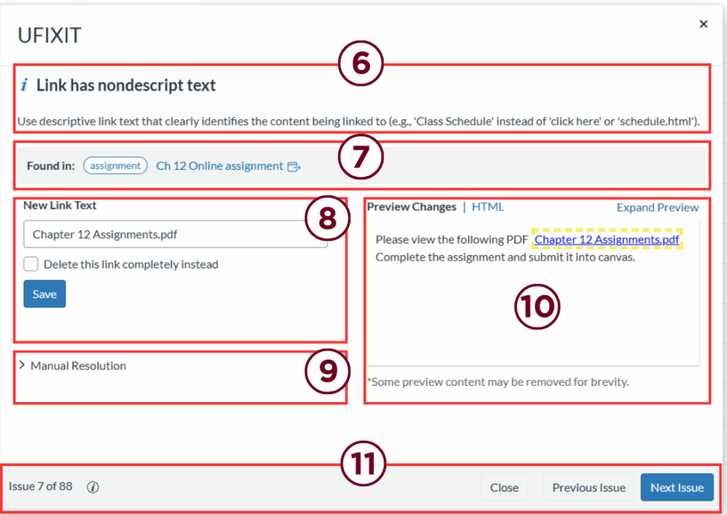 At the top (6) you’ll find information about the issue. Below that (7) you’ll see where the issue was found and a link that will take you there. On the left (8 & 9) you have two possible actions. First (8), for some issues you can make a direct change that resolves the issue. For more complex issues you may only see suggestions here that require more work. Second (9), you have the option to manually resolve the issue. Basically, this just tells UDOIT to ignore it without fixing it. Please DO NOT use this option. OTL can help you correct difficult issues, and it is better to address them rather than ignore them.